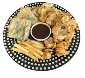 A hearty sharing plate featuring Indonesian favorites: crispy tempe mendoan, golden bakwan kentang, classic French fries, and savory tahu racer, all served with Wistara’s signature dipping sauce. Perfect for family and friends to enjoy together.