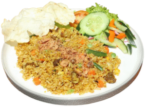 A bold and aromatic fried rice dish with tender goat meat, stir-fried with signature spices and herbs. Served hot for those who love rich, savory flavors.